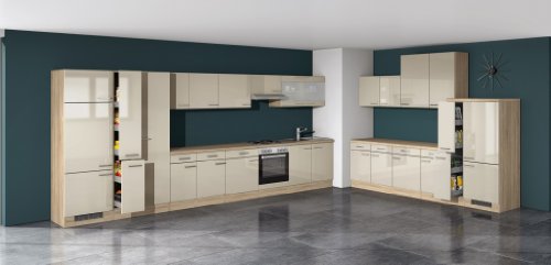 Melaminbeschichtete, glänzende Kunststoffoberfläche in Kaschmir. Alle Fronten mit umlaufender Dickschichtkante.