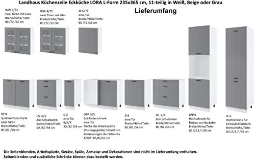 Specification: Möbel für Dich Landhaus Küchenzeile Eckküche LORA L-Form 235×365 cm, 11-teilig in Weiß, Beige oder Grau (beige)