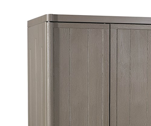 Hochschrank aus Kunststoff, Maße: 65 x 45 x 172 cm. Holzdesign, braun, ideal für Wohnungen, Terrasse und Garage. Kein Rost, Dellen und Abblättern. Leicht zu öffnende und abschließbare Türen Robuste Einlegeböden Es handelt sich um einen Schrank mit einfacher und schneller Montage ohne Werkzeug. Praktisch und nützlich, findet Platz in verschiedenen Räumen, dank der hochwertigen Materialien, die verschiedene Wetterbedingungen standhalten.