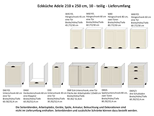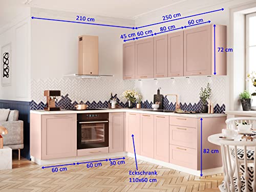 Specification: Landhaus Eckküche 210×250 cm Adele mit Rahmenfronten in Puderrosa, Weiß, Samtblau, Grau oder Coffe