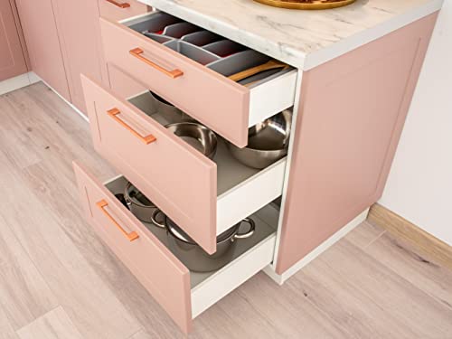 Standardmäßig wird die Küche wie auf dem Bild 1 ausgeliefert. Das heißt, mit Fronten in Puderrosa und mit eckigen Kupfergriffen. Wenn Sie eine andere Farbkombination oder andere Griffe wünschen – rufen Sie uns an oder schreiben Sie uns eine Nachricht.